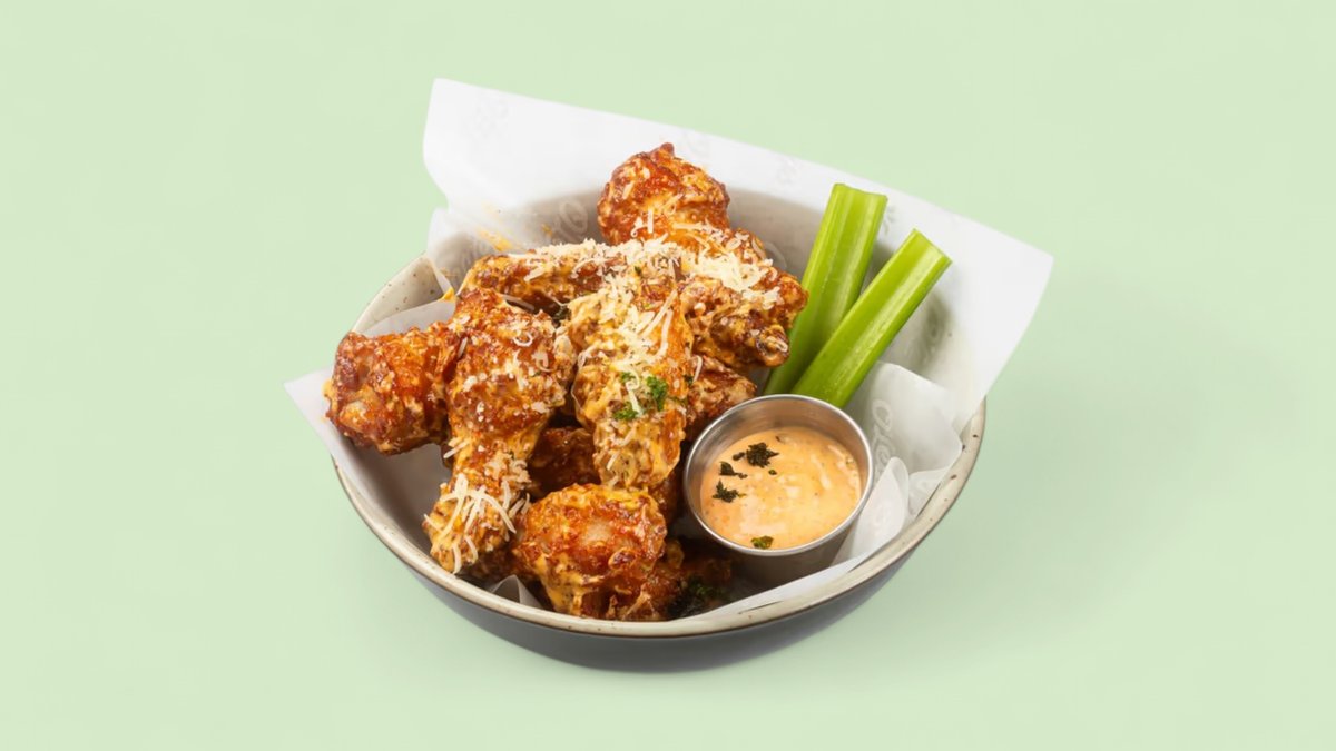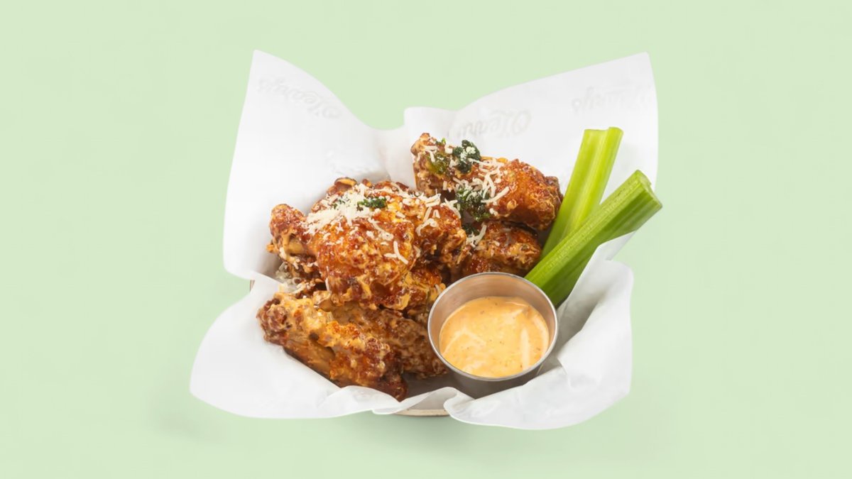 Fritēti vistas spārniņi krēmīgā parmezāna un ķiploku mērcē. Pasniegti ar seleriju nūjiņām un parmezāna-ķiplolu mērci. Pārkaisīti ar rīvētu parmezāna sieru.