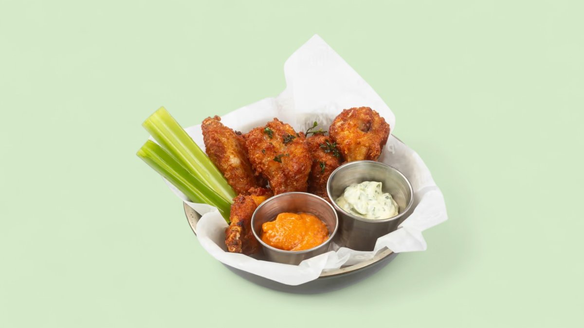 "Fritēti vistas spārniņi, pasniegti ar kraukšķīgām seleriju nūjiņām, pikantu Buffalo un Ranch mērci."