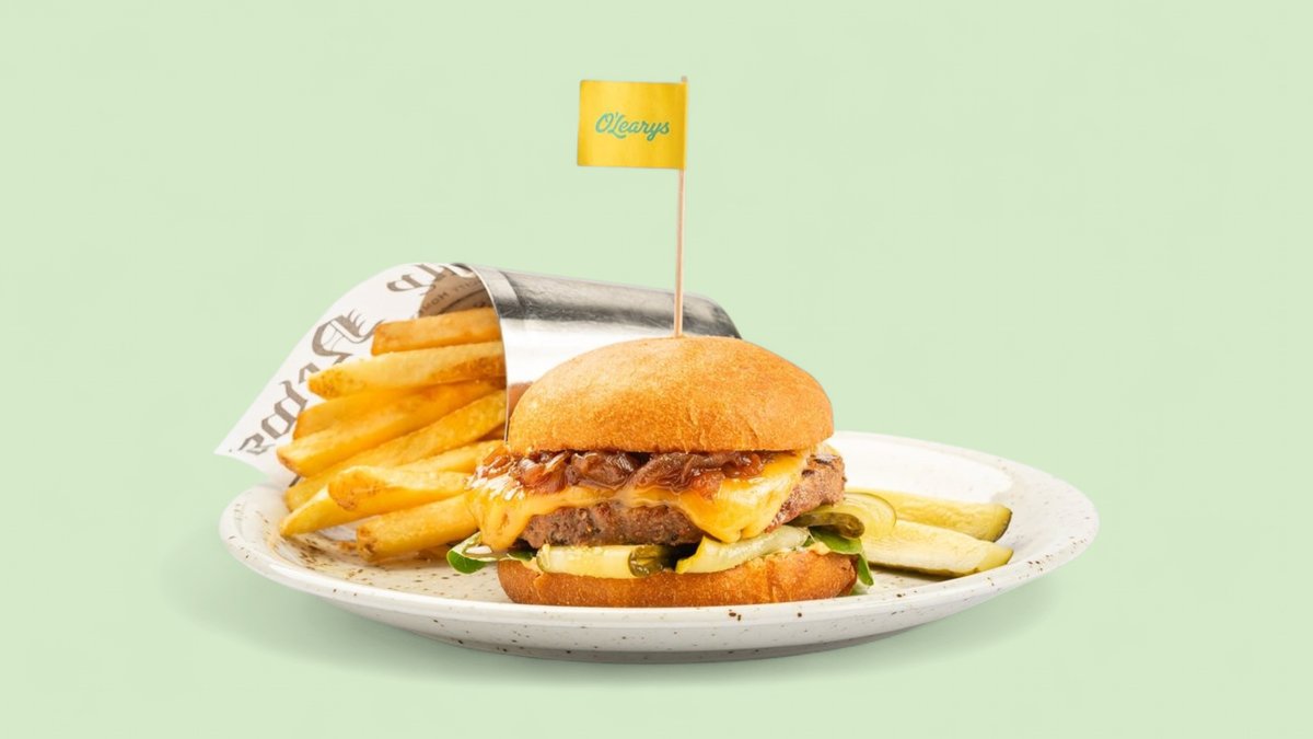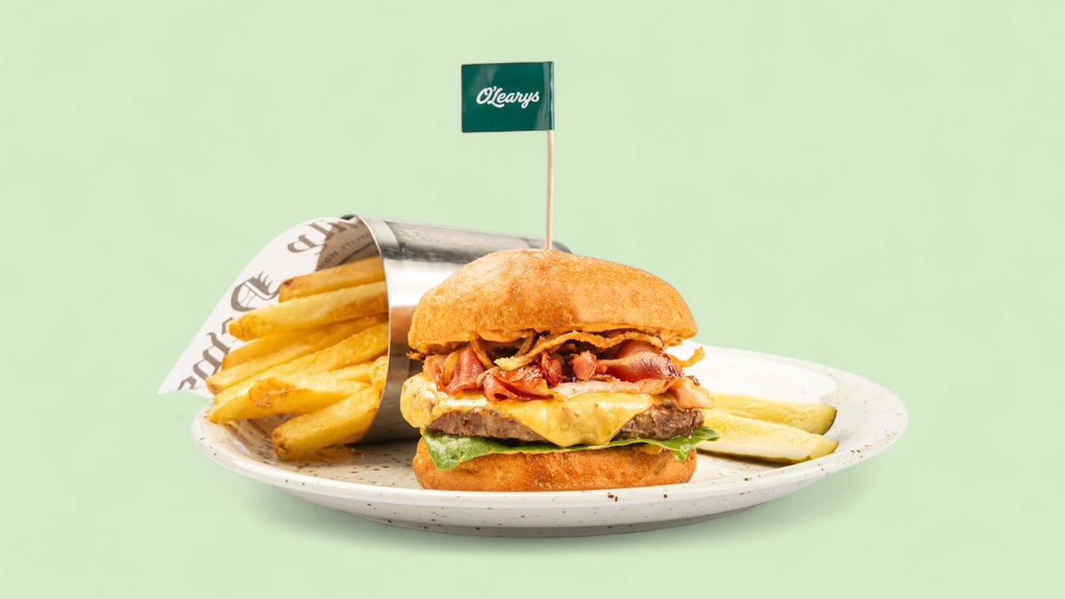 Burgers ar hamburgera mērci, bekonu, dziļi ceptiem sīpoliem, kraukšķīgiem salātiem, O'Learys īpašo BBQ mērci un Čedaras sieru.