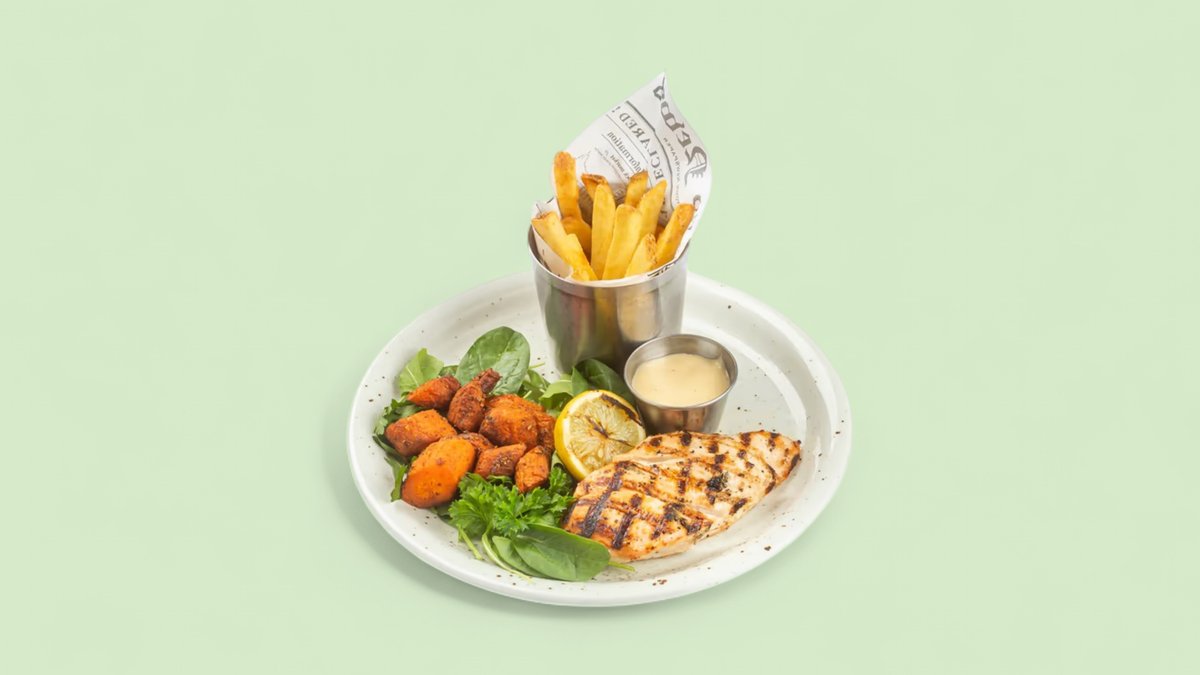Grilēta vistas krūtiņa, pasniegta ar salātiem, gurķiem, majonēzi un frī kartupeļiem.