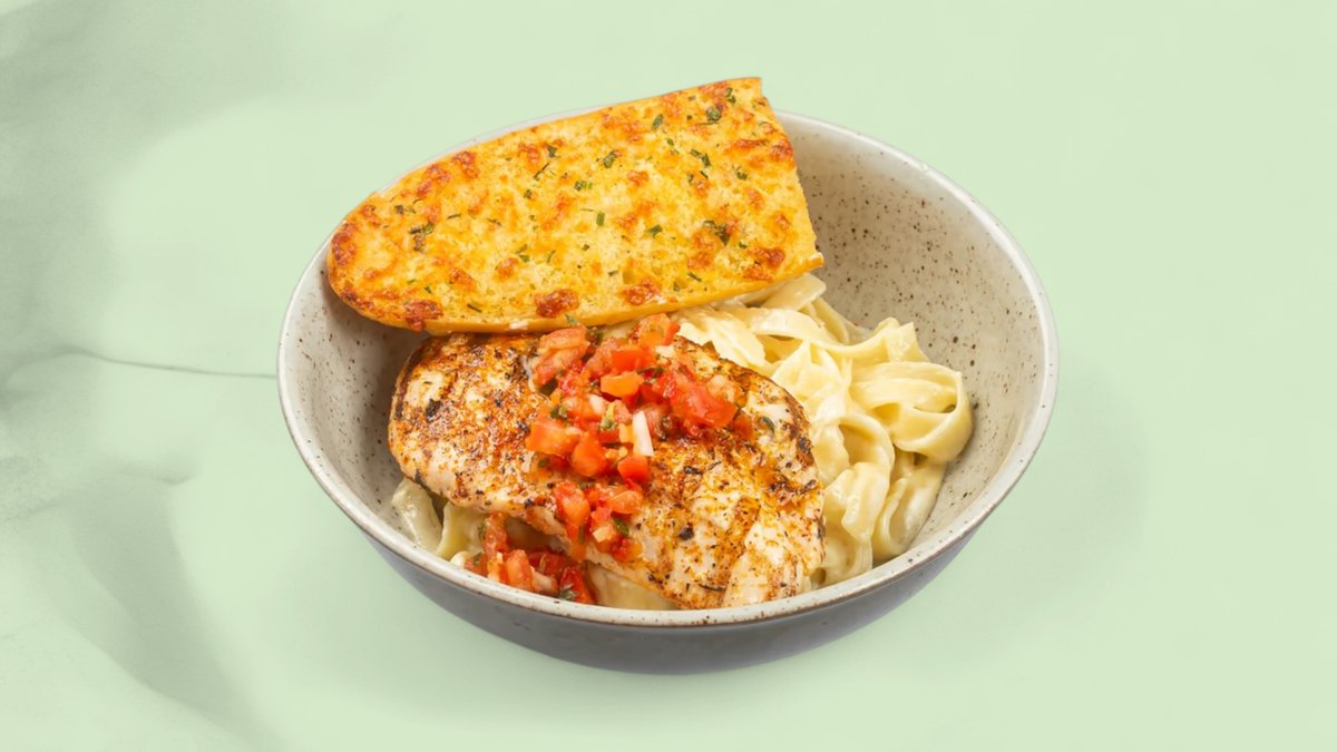 Pasta ar cieto sieru, vištinu un pico de gallo. Pasniegta ar siera ķiploku grauzdiņiem.
