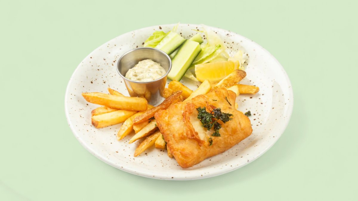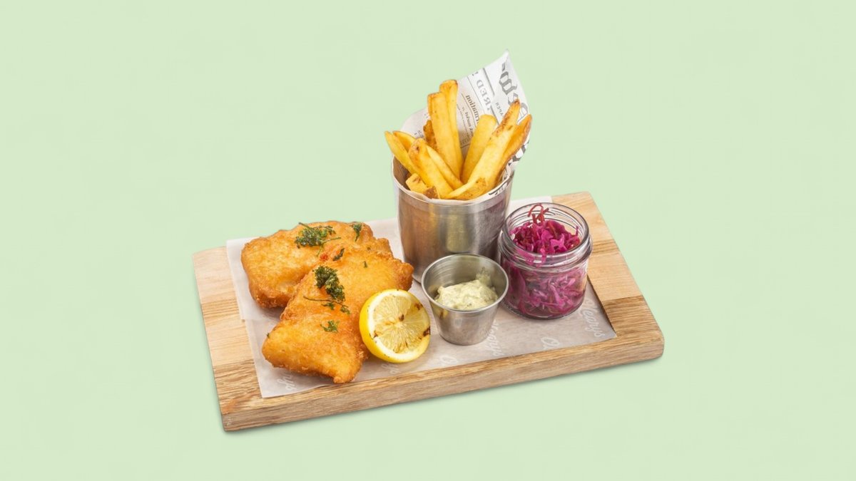 Kraukšķīgi fritēta mencas fileja, pārkaisīts ar fritētu pētersīli. Pasniegta ar tartara mērci, grilētu citronu, halapenjo marinētiem kāpostu salātiem un frī kartupeļiem.