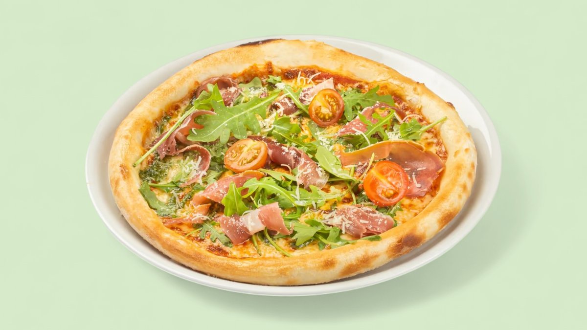 Tomātu mērce, mocarella, kūpināts šķiņķis, cietais siers, rukola, mājas pesto mērce un ķiršu tomāti.