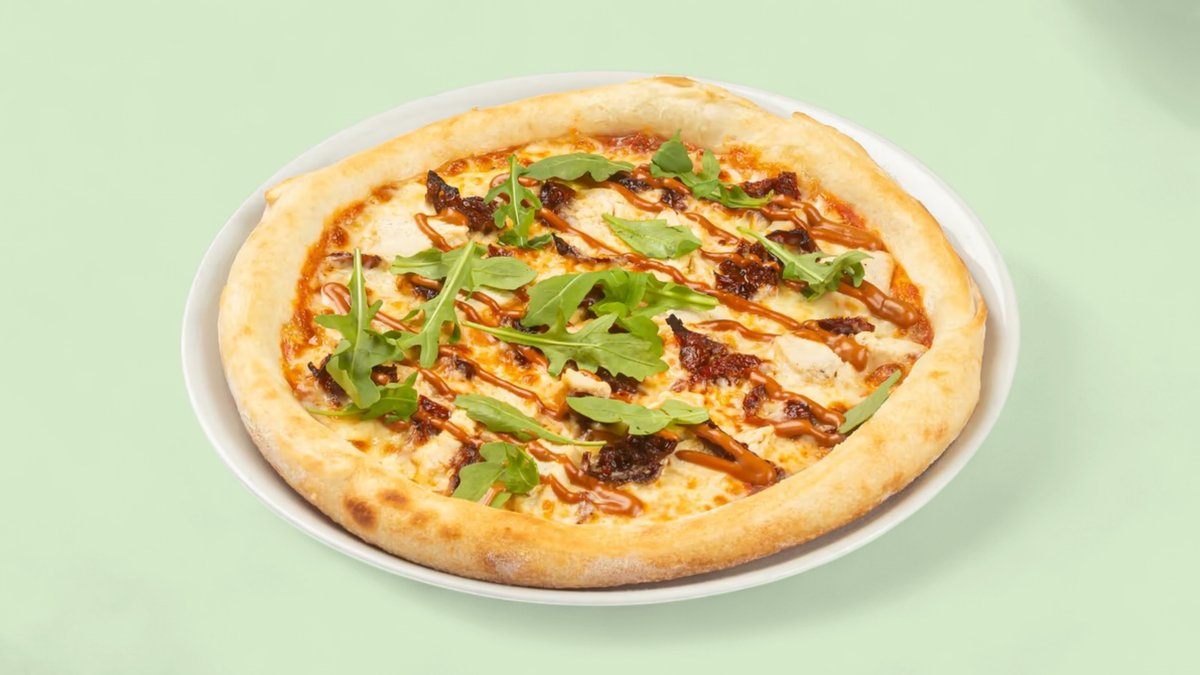 Tomātu mērce, mocarella, sēnes, vistas krūtiņa, mājas pesto mērce, cietais siers un rukola.