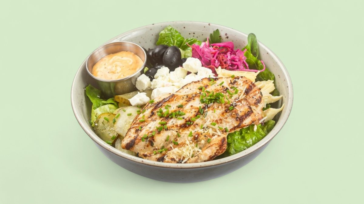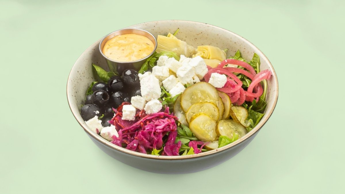 Salāti ar artišokiem, vistiņu, feta sieru, jauktiem salātiem, halapenjo marinētiem kāpostu salātiem, marinētu gurķi, melnajām olīvām, marinētiem sīpoliem un cieto sieru ar ķiploku mērci.