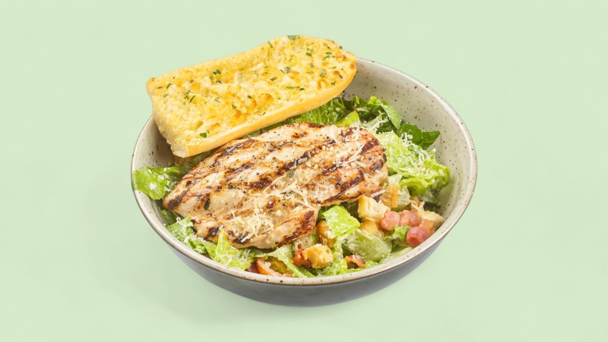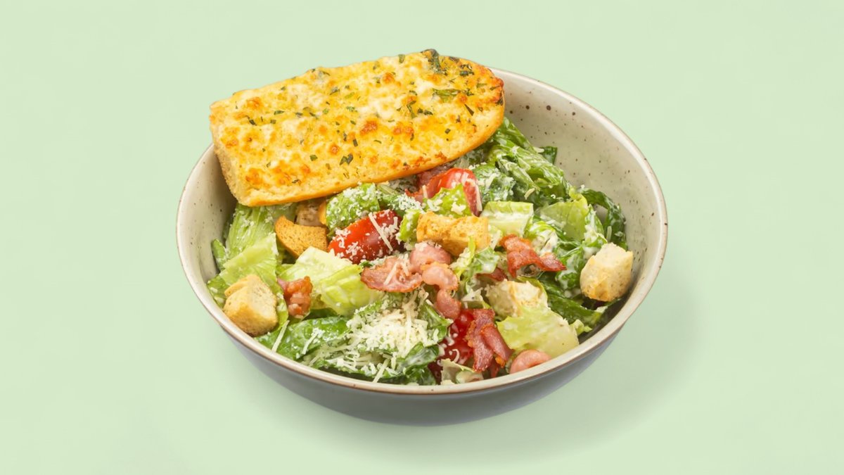 Klasiskie cēzara salāti ar bekonu, kraukšķīgu vistiņu, kraukšķīgiem grauzdiņiem, tomātiem, romiešu salātiem, anšovu mērci un cieto sieru. Pasniegta ar siera ķiploku maizes grauzdiņiem.