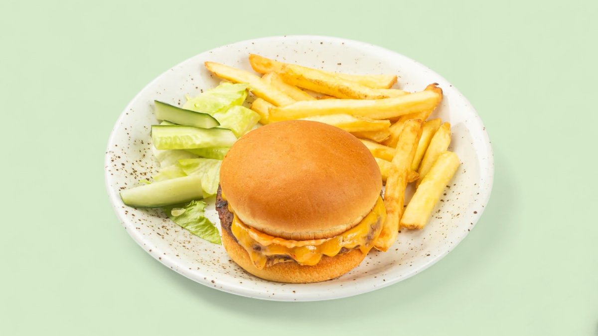 Burgers ar hamburgera mērci, dubulto čedara sieru, kraukšķīgām salātu lapām, marinētiem gurķīšiem un karamelizētiem sīpoliem.