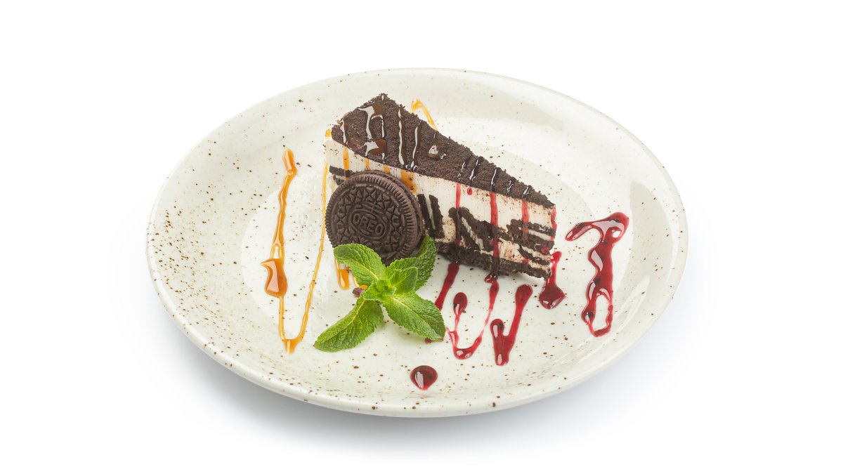 Klasiskā siera kūka ar sasmalcinātiem Oreo cepumiem, meža ogu un sāļās karameles mērci