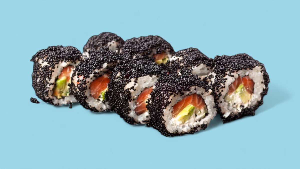 Nori, rīsi, masago ikri, cepts lasis, gurķis, krēmsiers,avocado