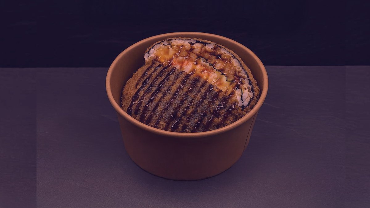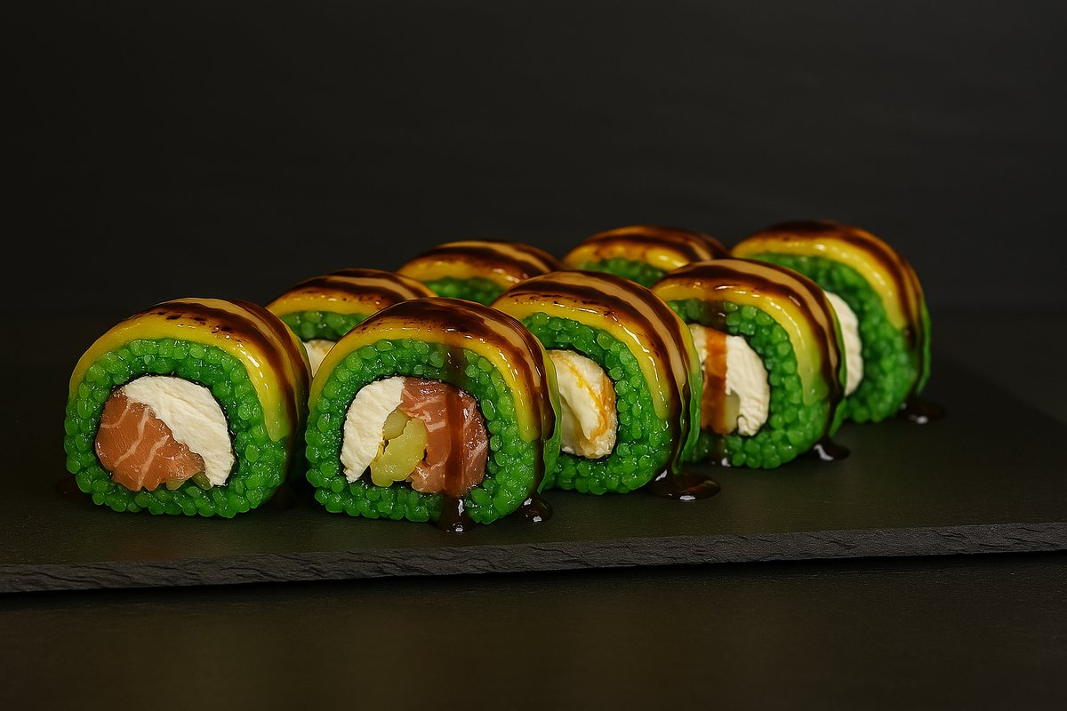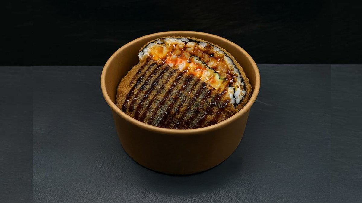 nori, rīsi, krēmsiers, avokado, gurķi, unagi mērce, tempura, panko rīvmaize.