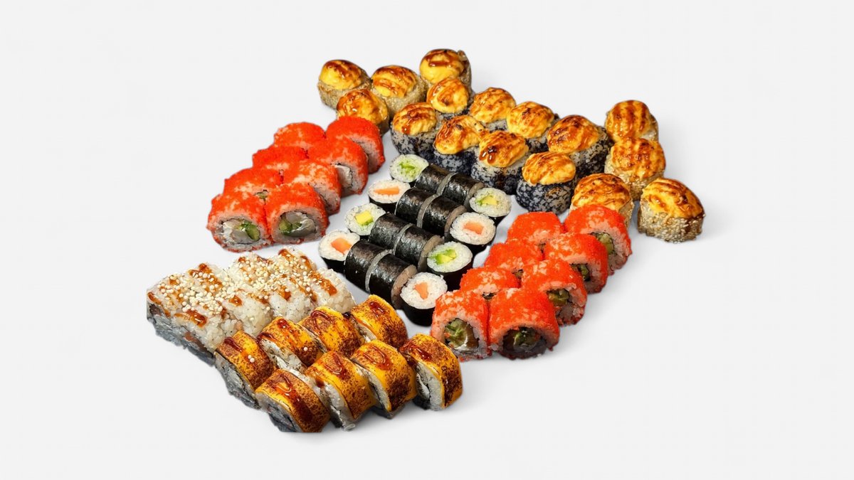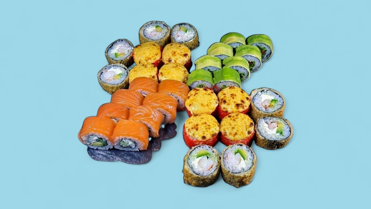 Nori, rīsi, cepts lasis, rīsu bumbiņas, unagi, gurķis, krēmsiers, tuncis, masago ikri.