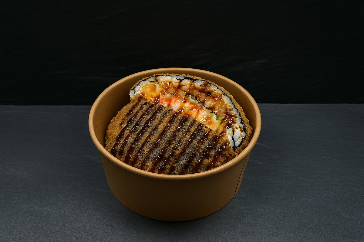 nori, rīsi, krēmsiers, avokado, gurķi, unagi mērce, tempura, panko rīvmaize.
