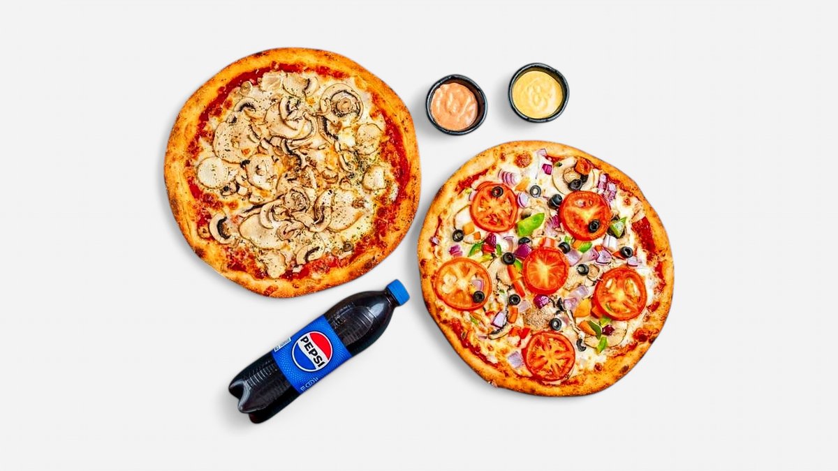 choose your own 2 veggie 🥗 pizza , 2 sauce , 500ml drink