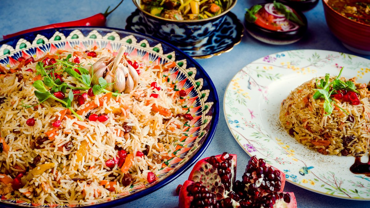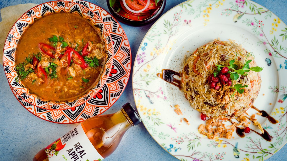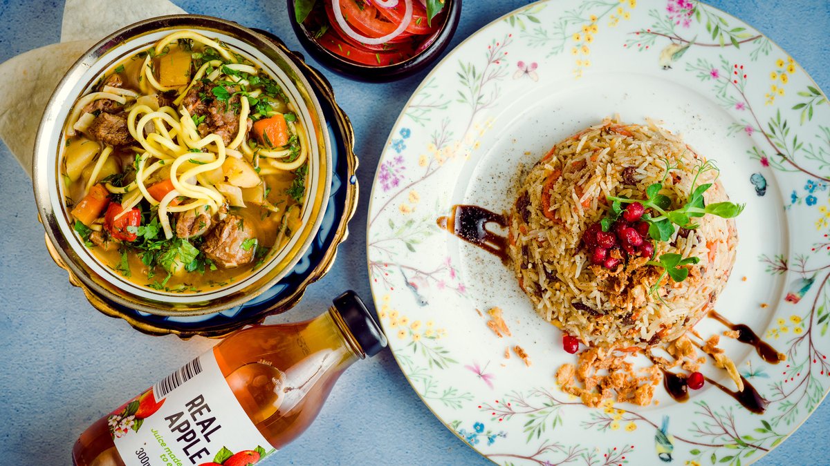 Plovs ar jēra un liellopa gaļu + aču-čuk salāti +lavašs +lagmans+ sula