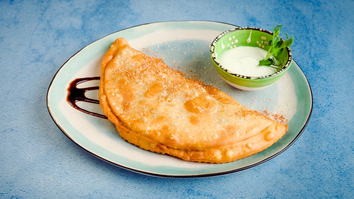 Čebureks ar vistas šašliku un sieru pasniegts ar rančo mērci