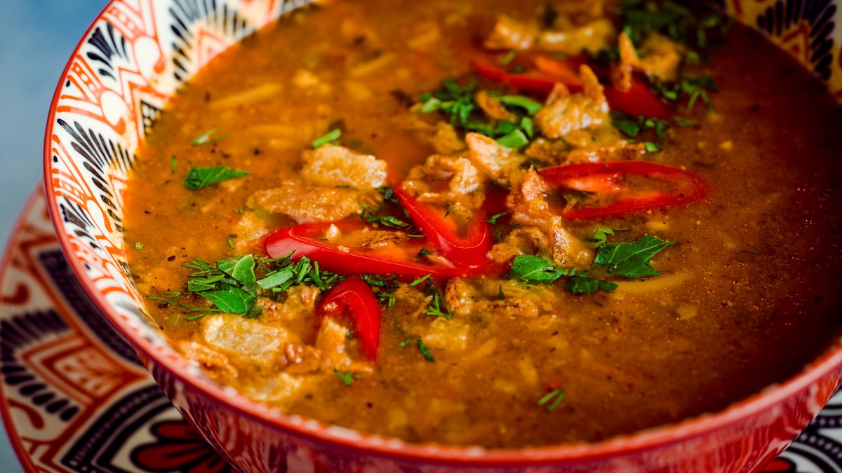 Pikantā jēra gaļas harčo zupa, gatavota kazanā