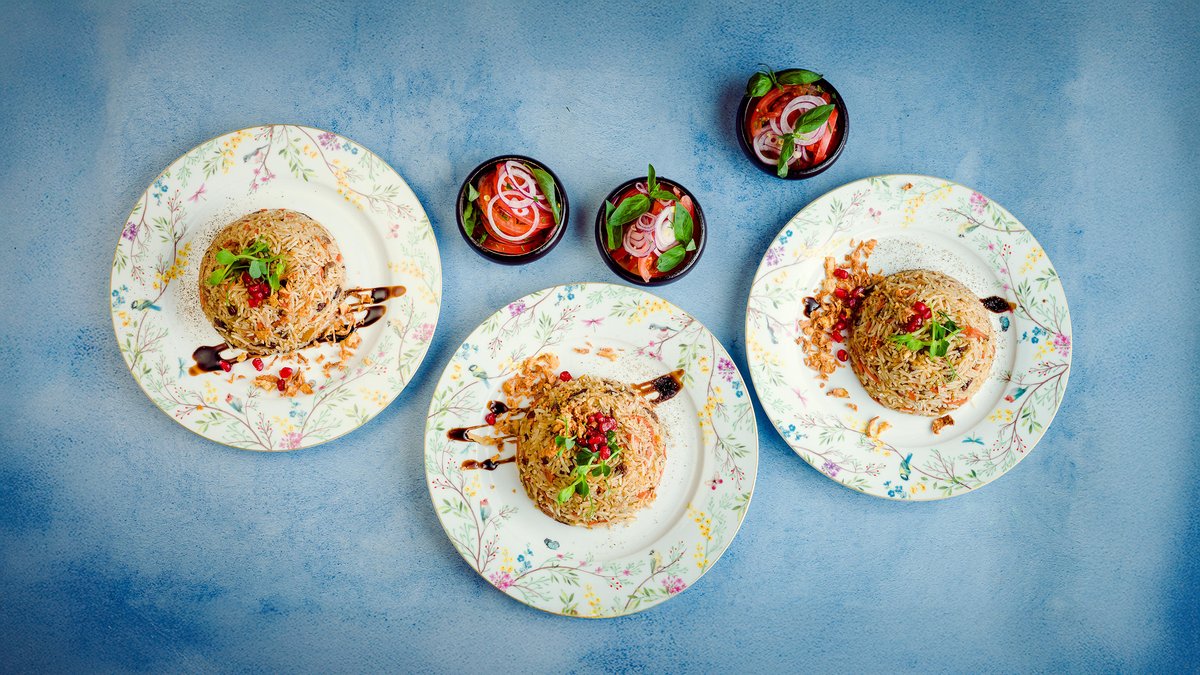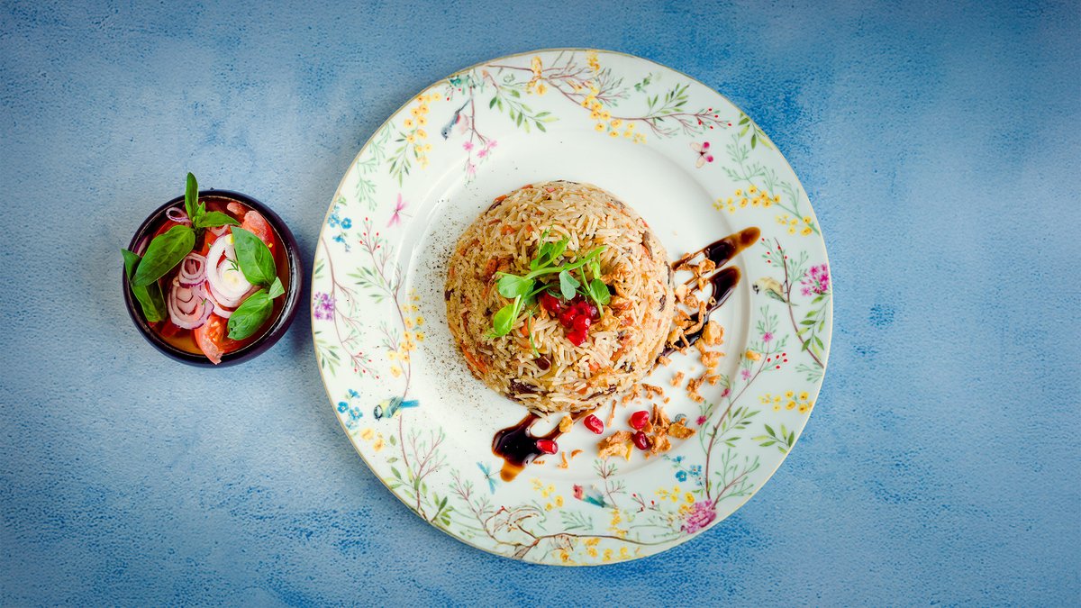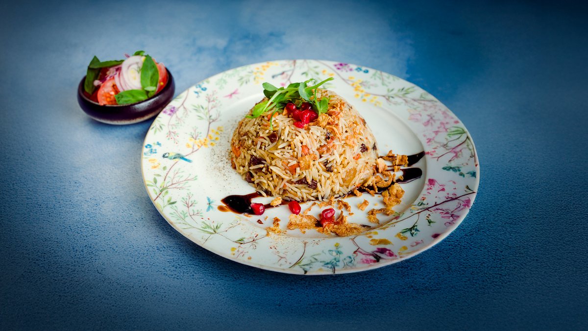 Pikantais plovs ar jēra un liellopa gaļu čaihanas gaumē un aču-čuk salātiem