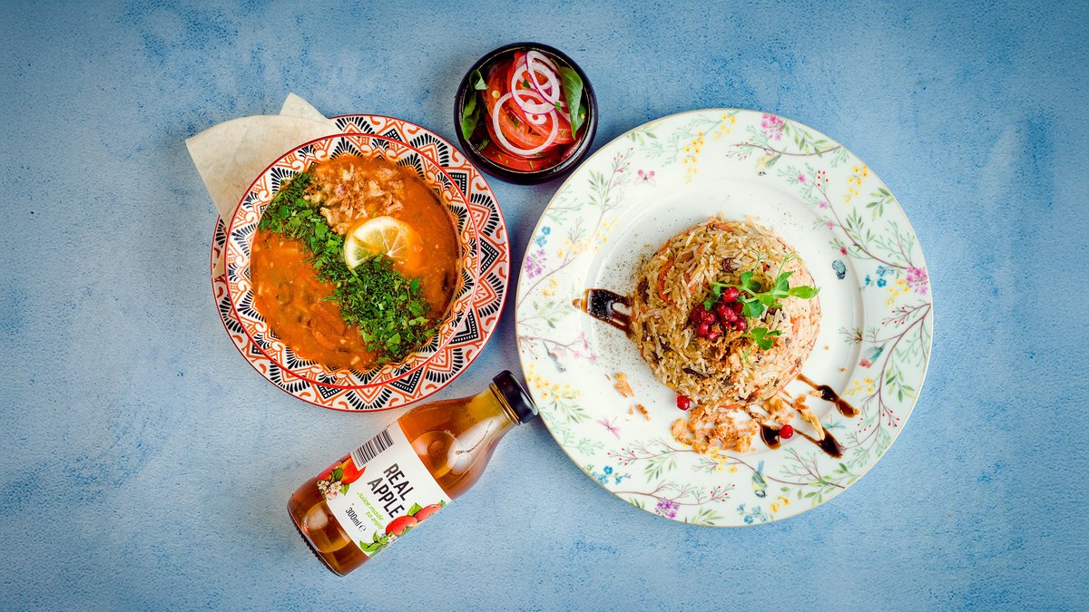 Jēra un Liellopa gaļas plovs + Jēra gaļas Harčo zupa + Salāti “Ačuk Čuk” + Lavašs + Sula