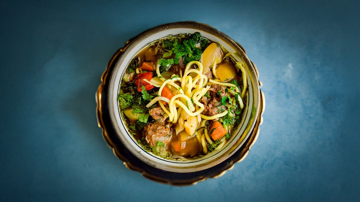 Liellopa un jēra gaļas “LAGMAN” pasniegts ar olu nūdelēm