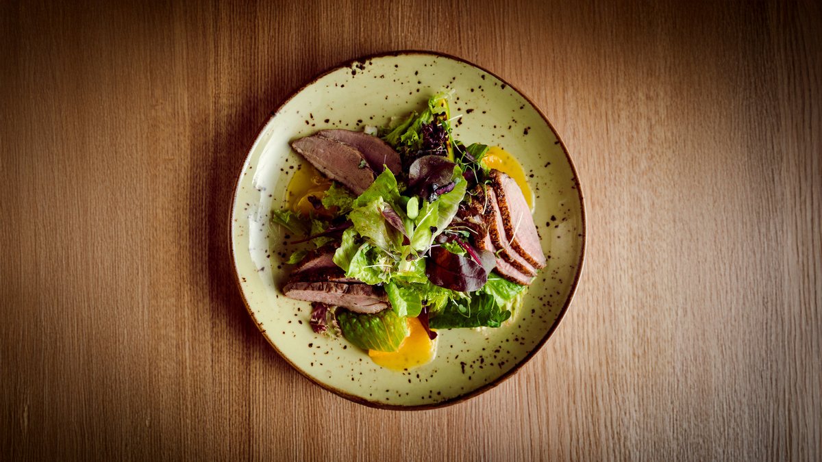 ar lapu salātiem, sparģeļiem un apelsīnu mērci