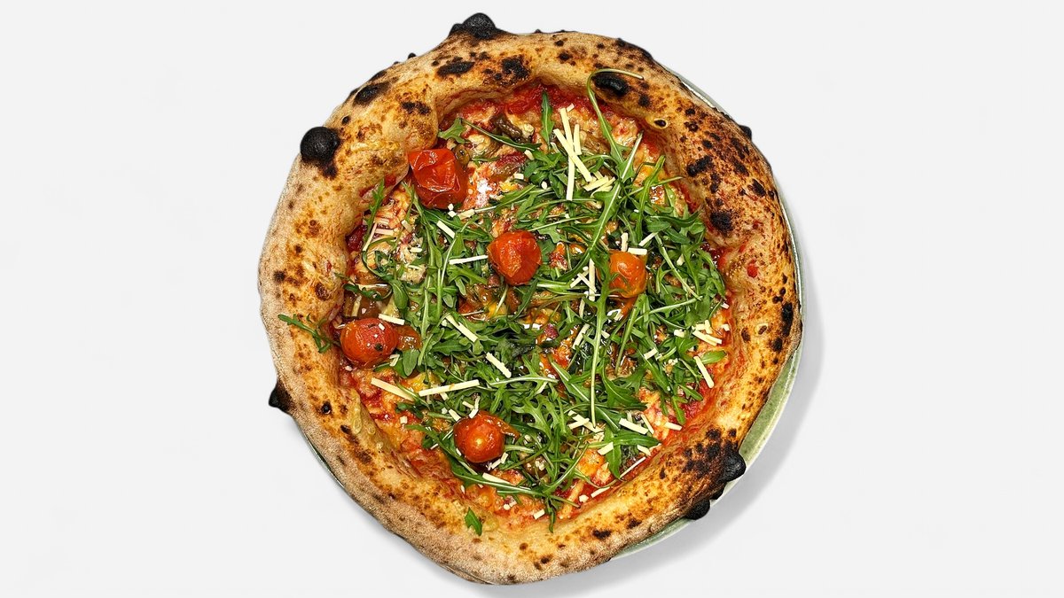 (VEGAN) tomātu mērce, origano, ķiploki, sēnes, rukola, ķirštomātu konfits, vegānais siers, extra virgin olīveļļa