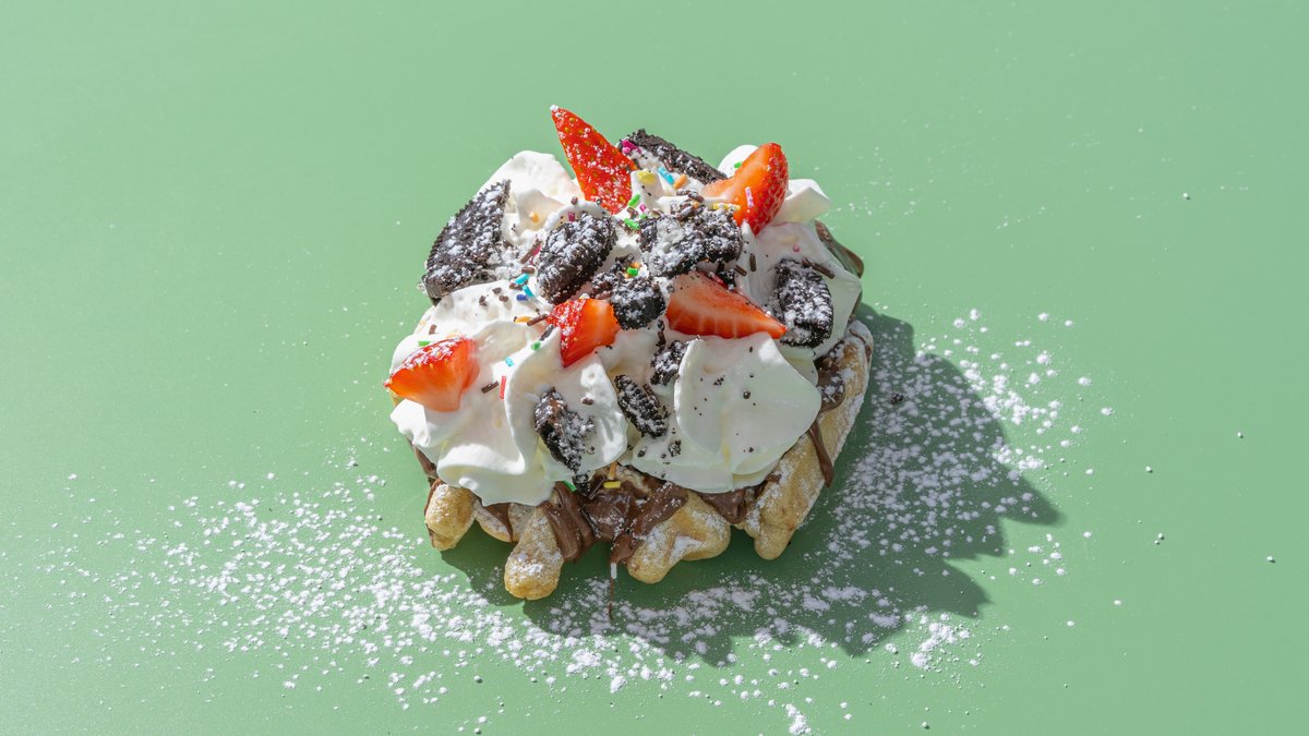 (Saldā vafele,nutella,putukrējums,oreo cepumi,sezonas ogas ,šokolādes gabaliņi,pūdercukurs)