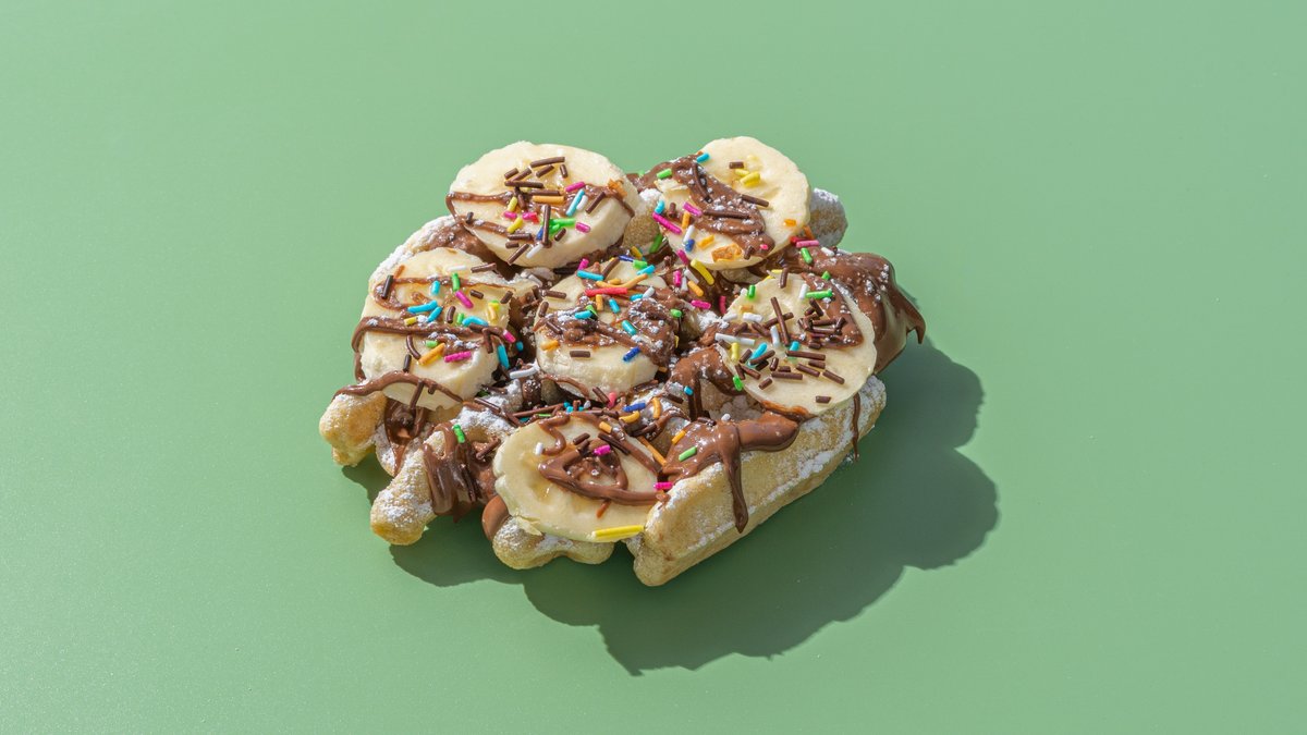 Saldā vafelīte, nutella , banānu šķēles, šokolādes skaidiņas, pūdercukurs