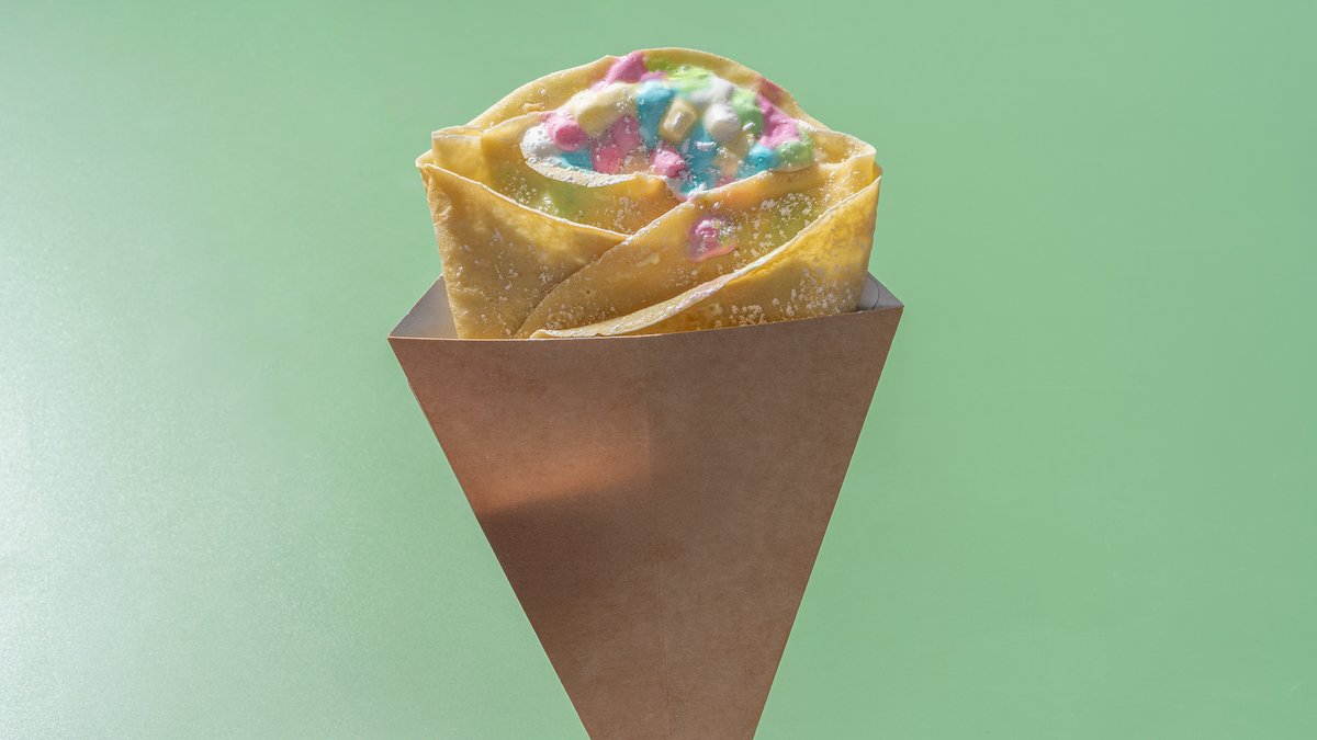Crepe pankūka , iebiezināts kondensēts piens , banāni ,krāsainie maršmello zefīriņi , pūdercukurs
