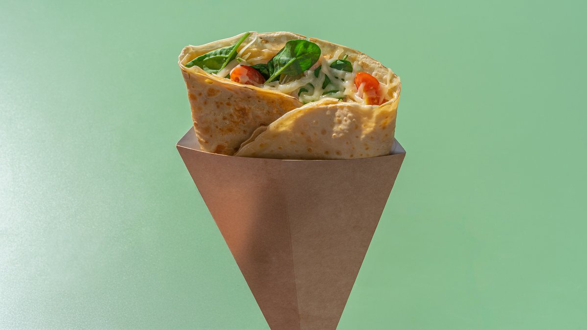 Crepe pankūka, Kečonēzes mērcīte, siers, spināti, cherry tomāti, marinēti gurķi
