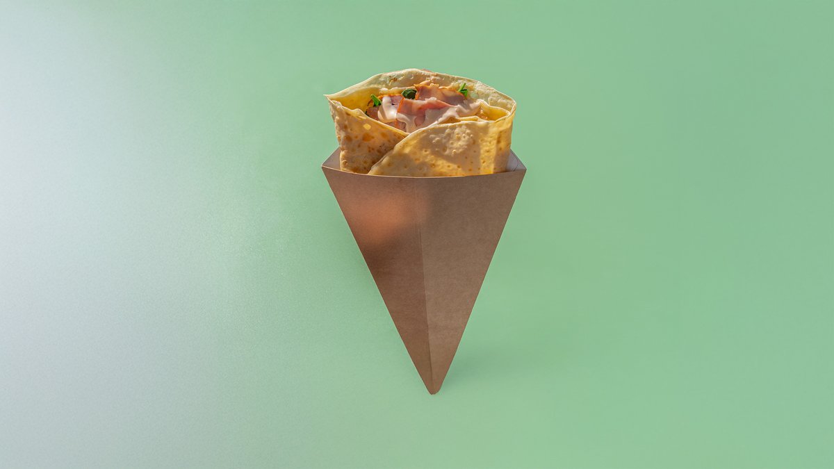 Crepe pankūka, Kečonēzes mērcīte, siers, spināti,cūkgaļas šķiņķis, marinēti gurķi