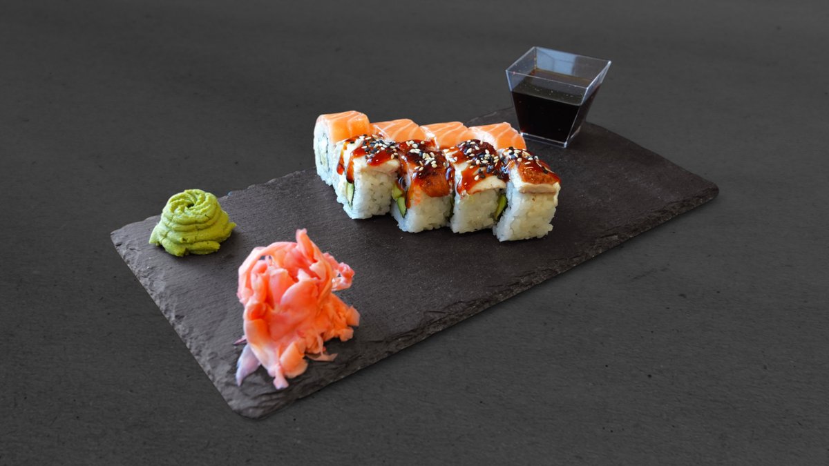 Rīsi,lasis,Philadelphia siers,avokado,gurķis,unagi mērce