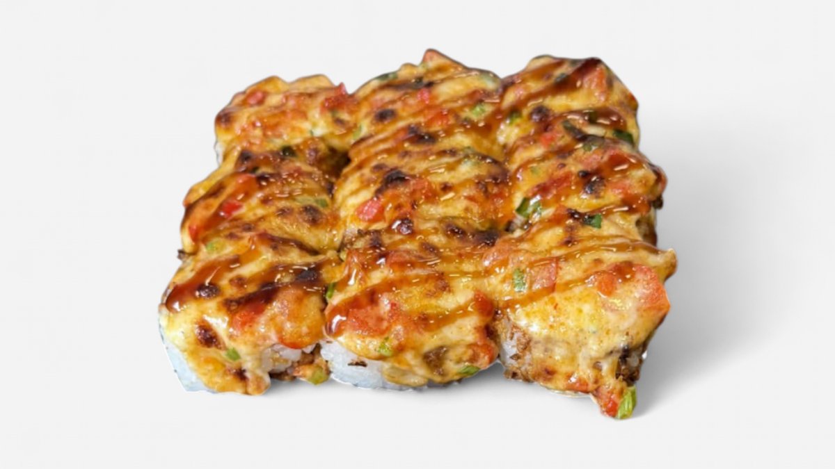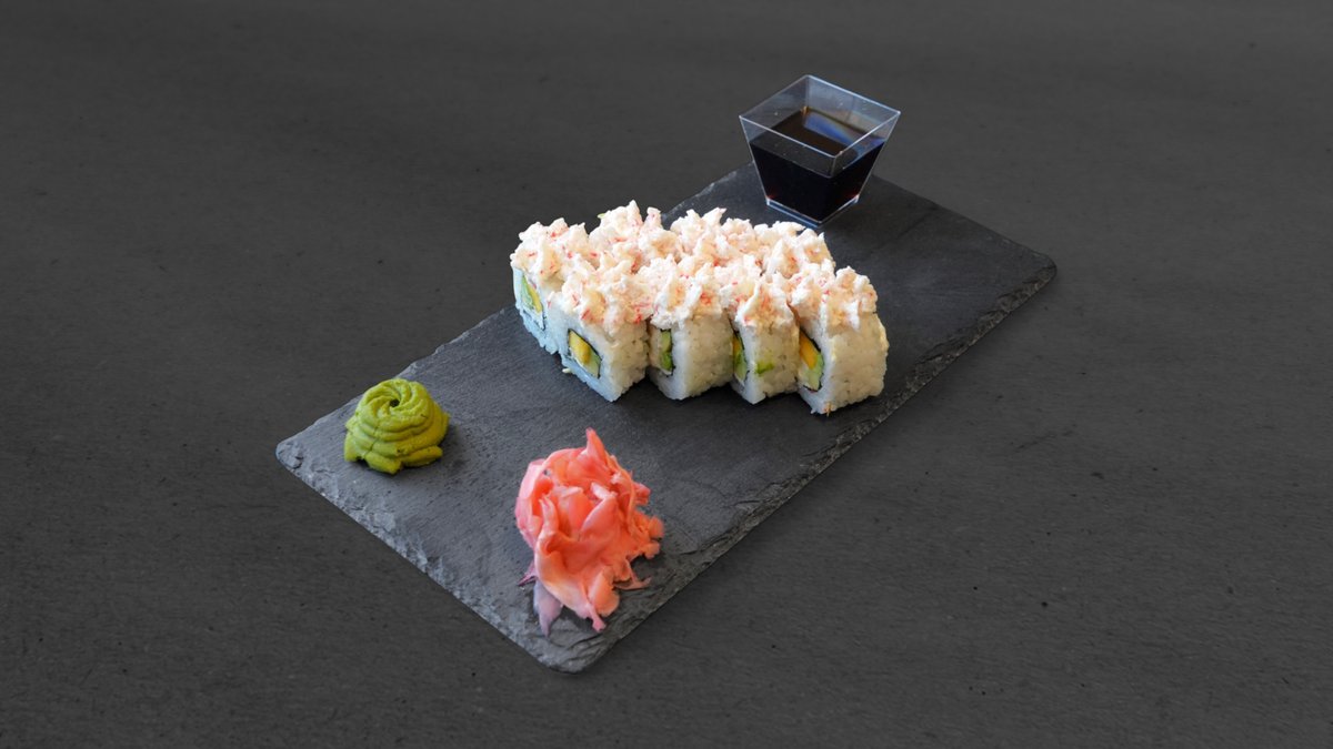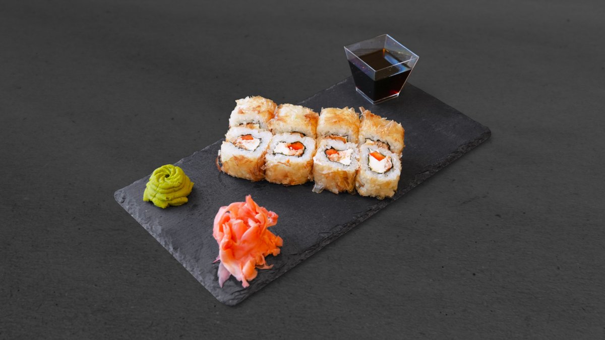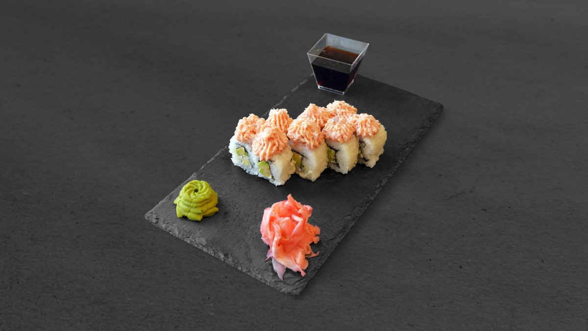Ar vistu. Rīsi,krabju masa,avokado,siers,terijaki mērce,masago sarkana