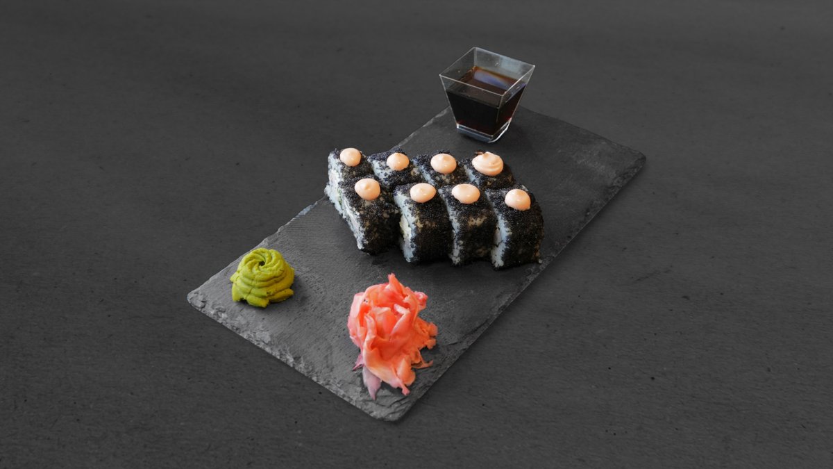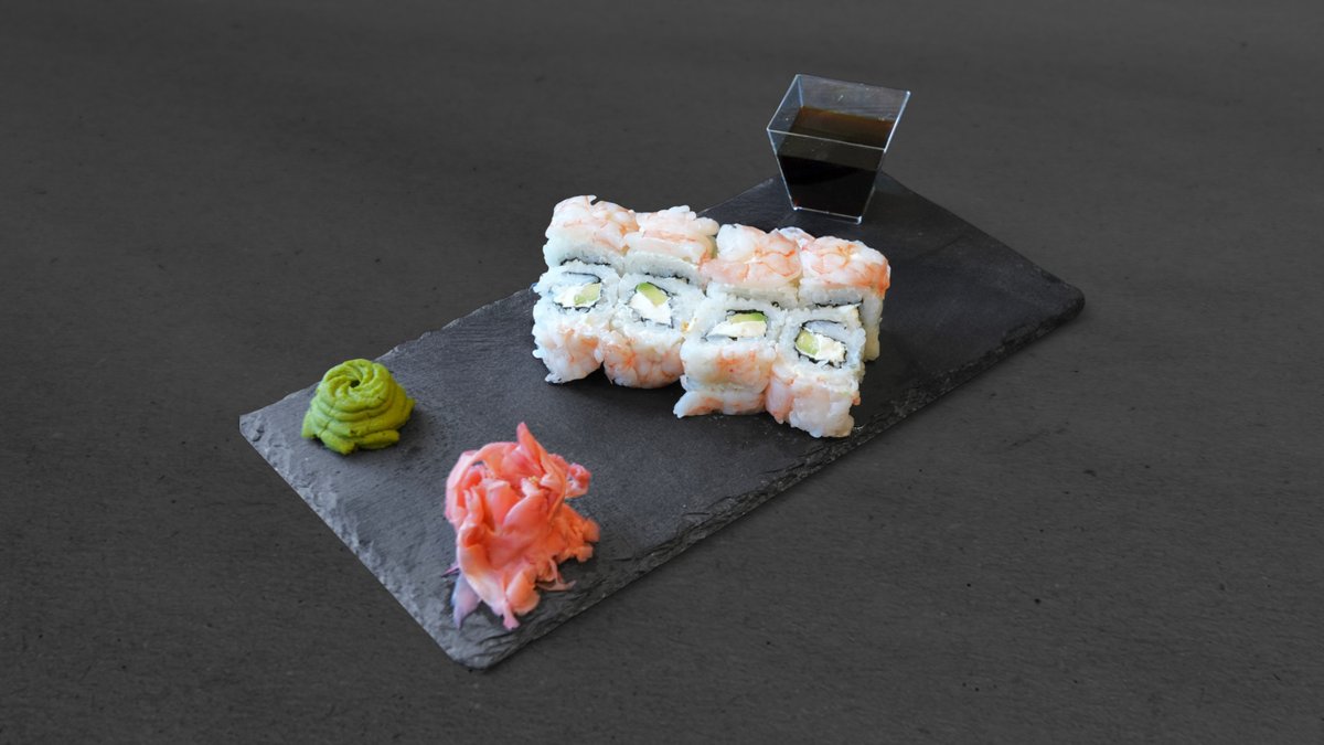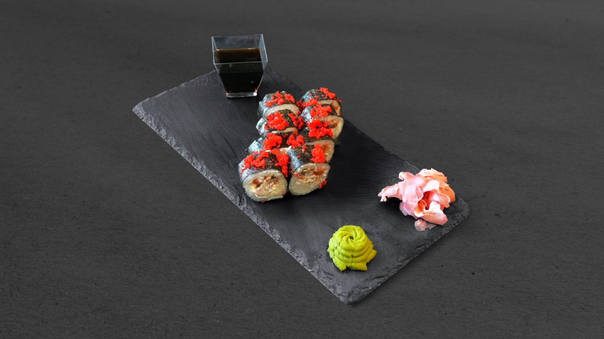 Rīsi,garneles,avokado,Philadelphia siers,masago melna,unagi mērce
