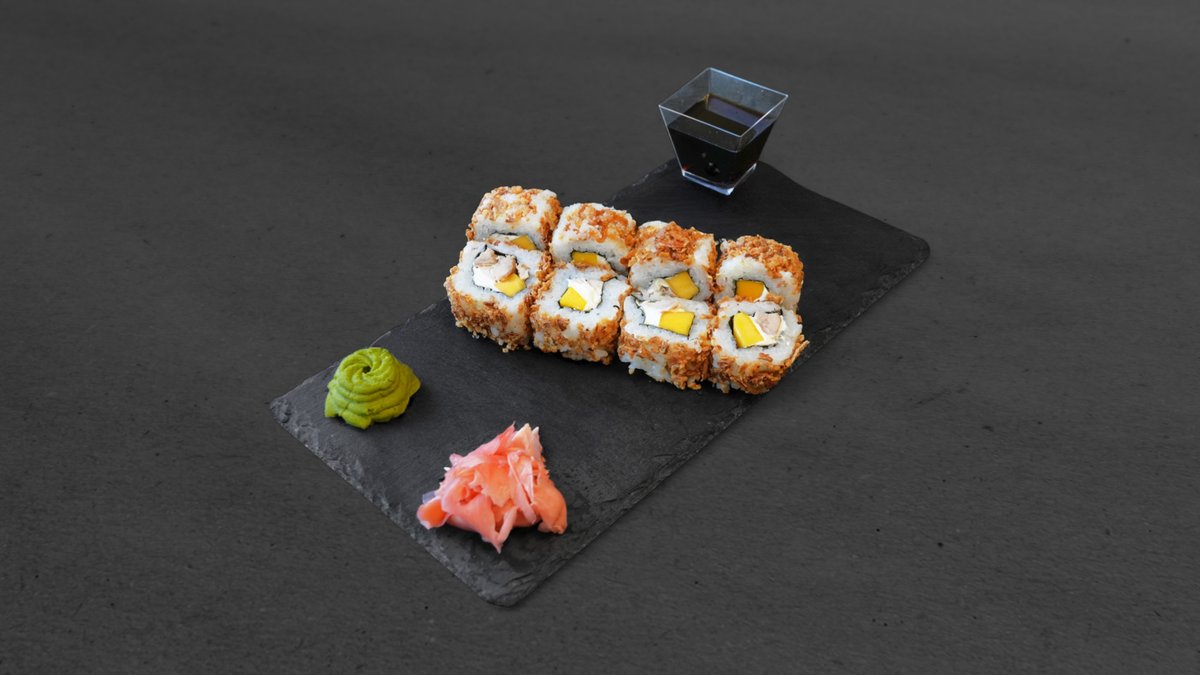 Ar vistu. Rīsi,avokado,mango,siers ar vistu, sezams,unagi mērce