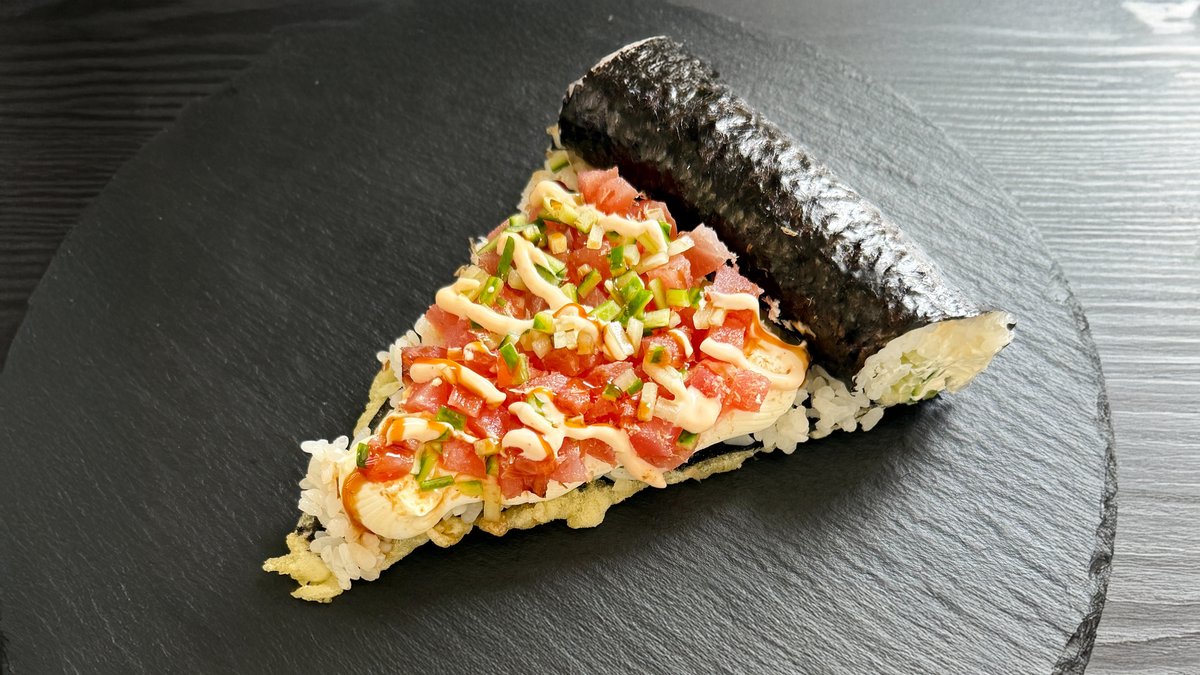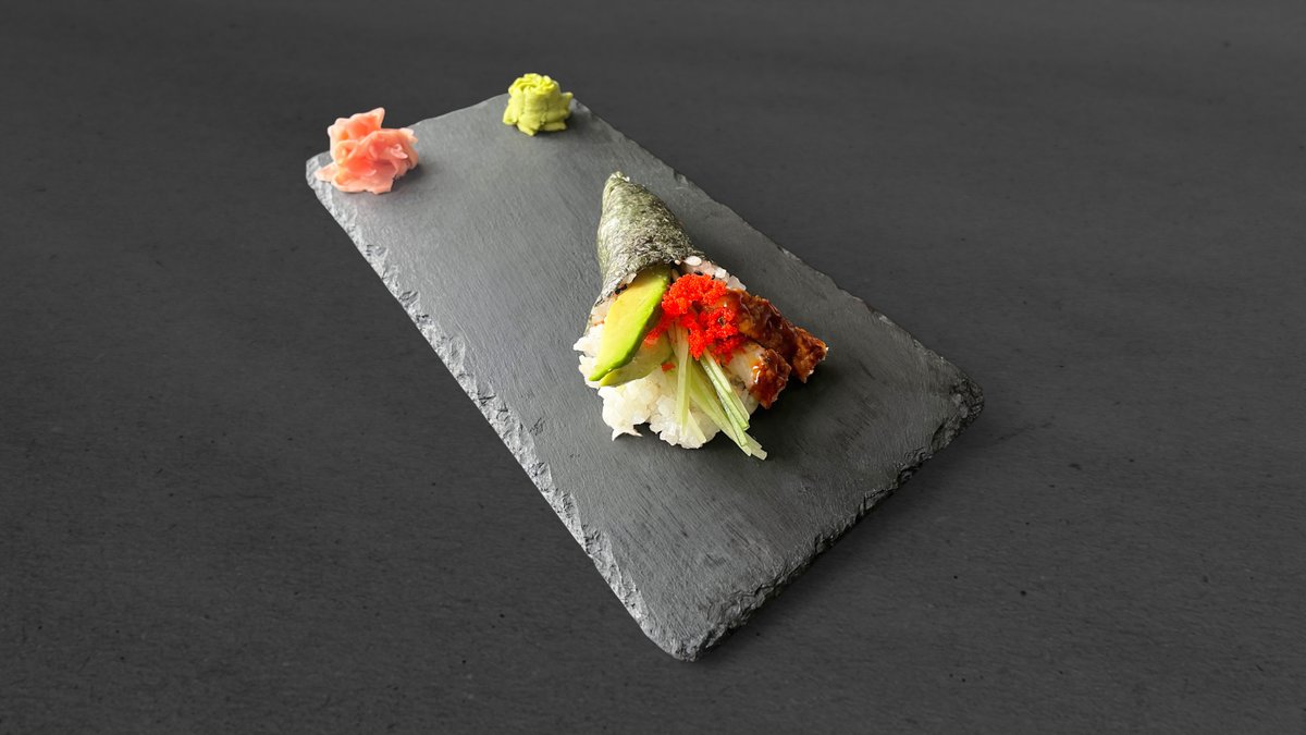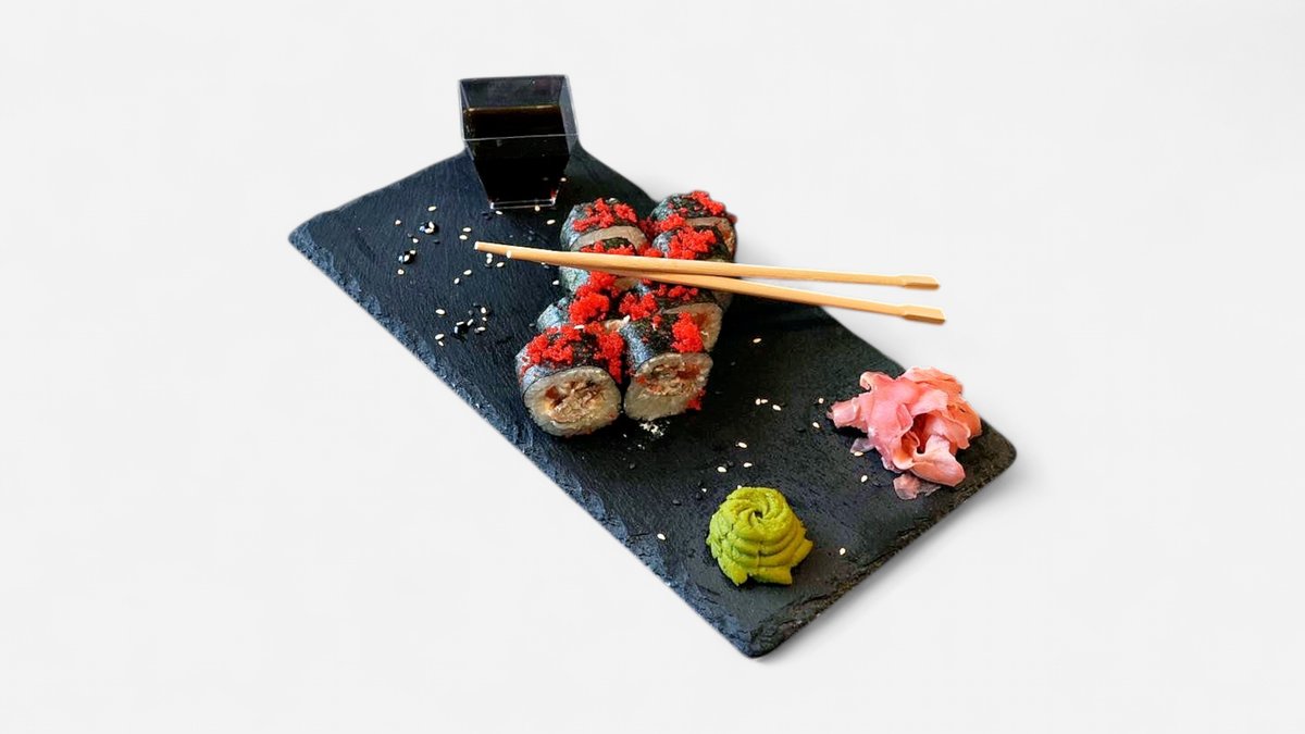 Rīsi,tuncis,avokado,masago sarkana,unagi mērce