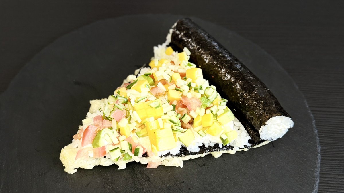 Ar vistu. Rīsi,gurķis,mango,garneles ar sieru,sarkana masago,