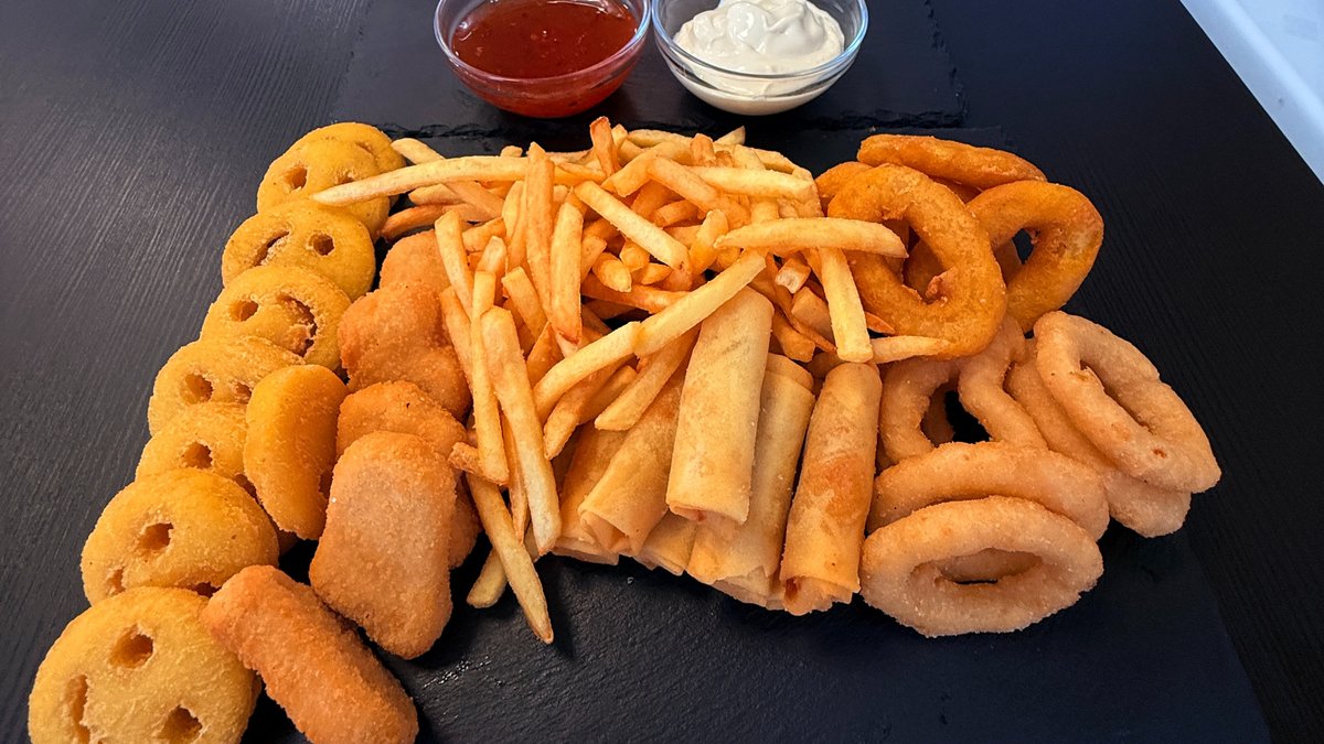 Vistas nageti 5 gab. Frī kartupeļi Garneles panējumā 7 gab. Sīpolu gredzeni 7 gab. Pavasara rullīši 7 gab. Kalmāru gredzeni 7 gab. Kartupeļu smaidiņi 9 gab.