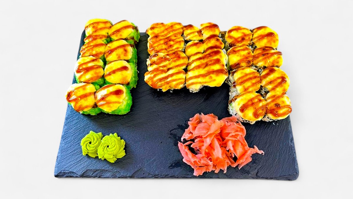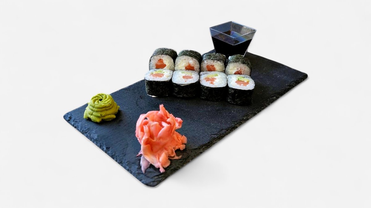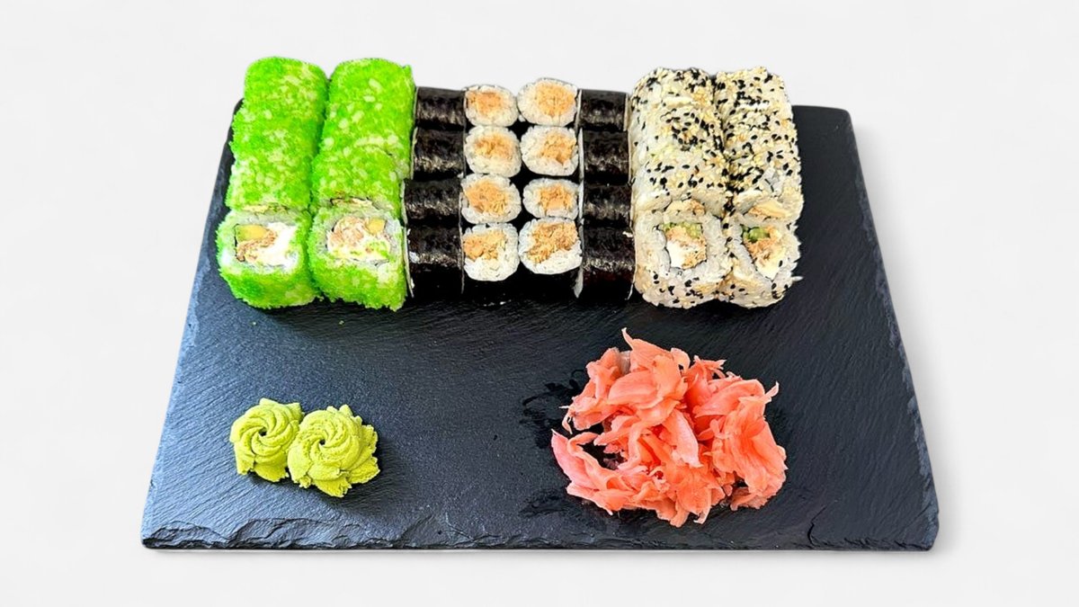 102.Philadelfija Sezam maki Risi,Philadelfija,Gurķis,Avokado,Lasis,Sezam seklas 109.Sake maki Risi,lasis,avokado,philadelfija siers 123.Kagami maki Risi,cepts lasis,paprika,philadelfija siers,tunča pārslas 50.Kappa Hosomaki Rīsi,gurķis 52.Avocado Hosomaki Rīsi,avokado 58.Sake Hosomaki Rīsi,lasis 322.Samura Ebi Hot maki Risi,Philadelfija siers,Garneles ar sieru,Masago sarkana 342.Sake Spice Hot maki Risi,Philadelfija siers,gurkis,asais Lasis,Masago sarkana Komplekat iet: 4 sojas mērcēs,wasabi,Kocini uz 4 personam.