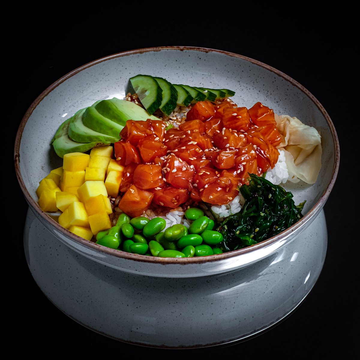 mango, gurķis, edamame, avocado, wakame, ingvers, unagi mērce, sezama sēklas, lasis, rīsi *attēlam ir ilustratīva nozīme