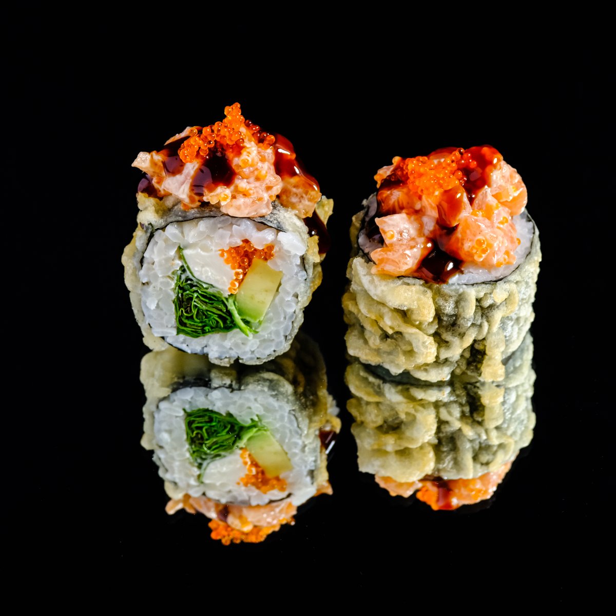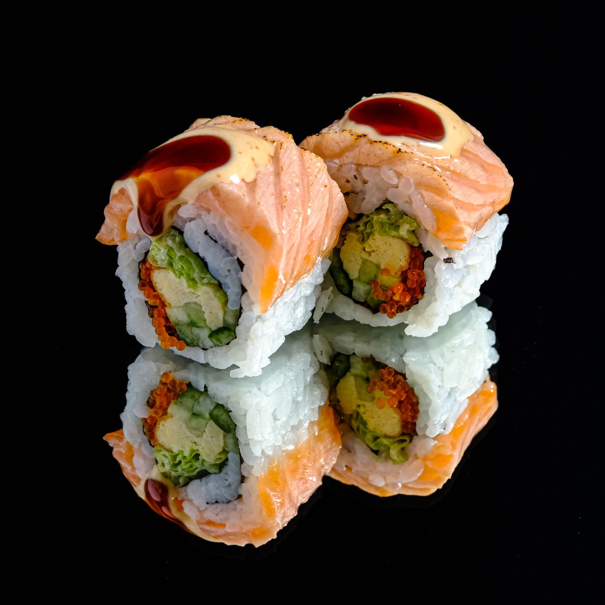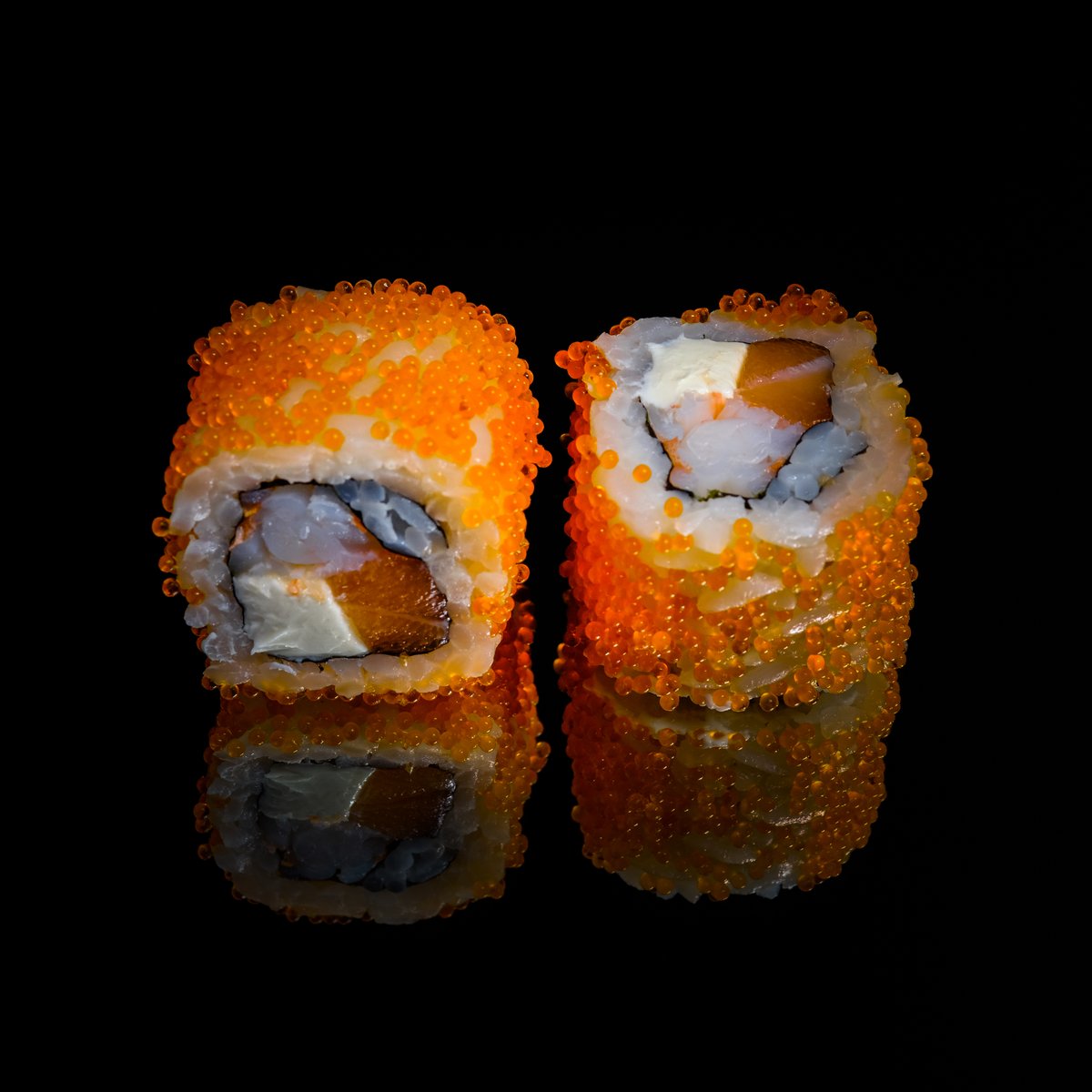lasis, asā mērce, tobiko ikri, lapu salāti, krēmsiers, avokado, unagi mērce) (1;4;3;7)