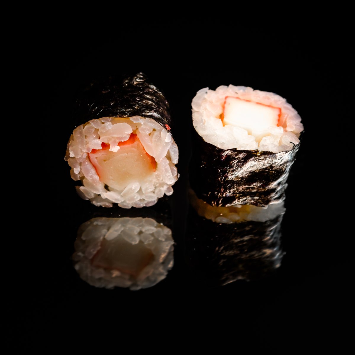 surimi, tobiko, avokado, lasis, gurķis, asā mērce (1;2;3;4;6)