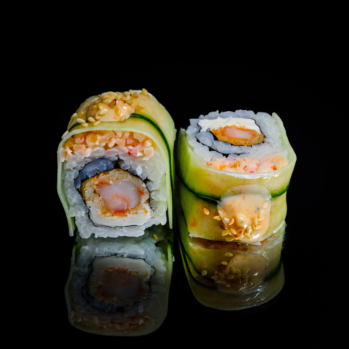 gurķis, tempura garnele, krēmsiers, asā mērce, surimi, sezama sēklas
