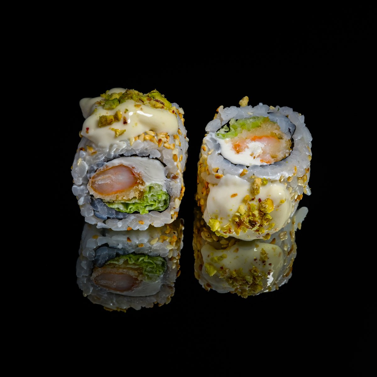 tempura garnele, japāņu omlete, krēmsiers, lasis, siera mērce, pistācijas) (2;3;4;8;7)