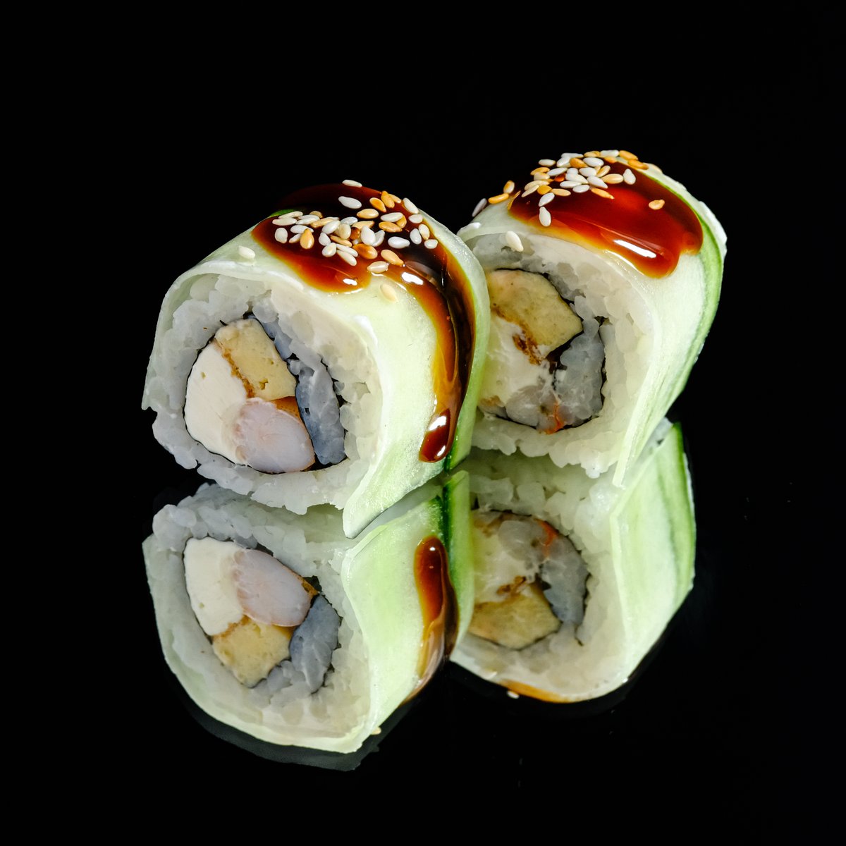 tīģergarnele, gurķis, krēmsiers, japāņu omlete, masago ikri, siera maisījums, unagi mērce) (4;3;7;2;11)