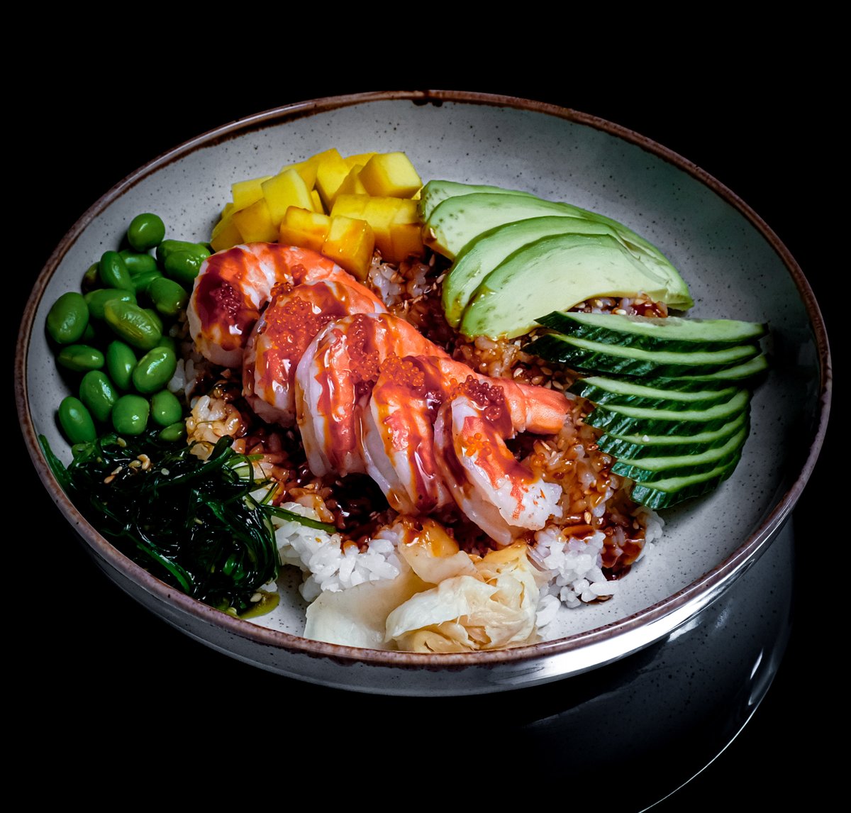 mango, gurķis, edamame, avocado, wakame, ingvers, unagi mērce, sezama sēklas, tobiko ikri, tīģergarneles rīsi *attēlam ir ilustratīva nozīme