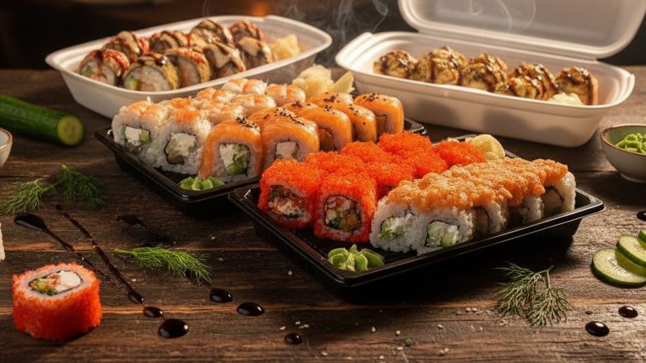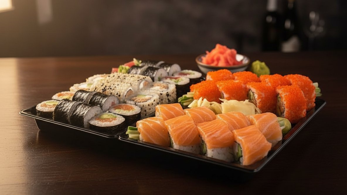Nori, rīsi, tempura garneles, Filadelfijas gurķi, mango