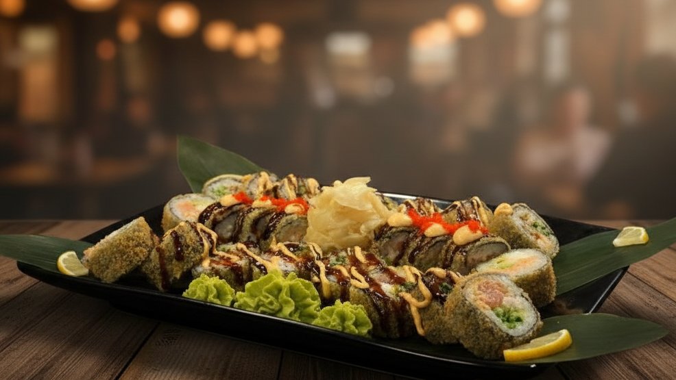 Nori rīsi, tempura garneles, Filadelfijas siera, wakame, aisbergu salāti, čedara siers. Dekorēts ar terijaki mērci.