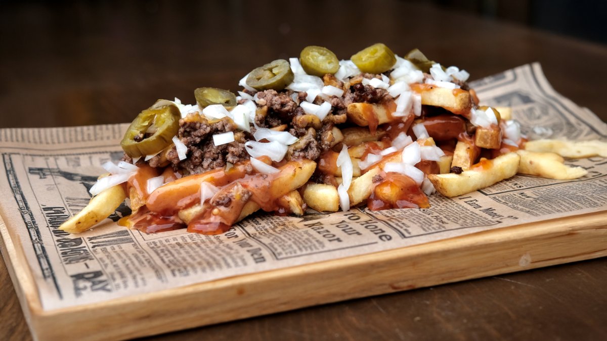 Frī kartupeļi ar liellopa gaļu, čedaras sieru, svaigiem sīpoliem un halapenjo