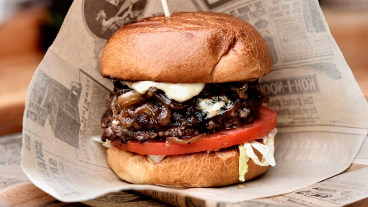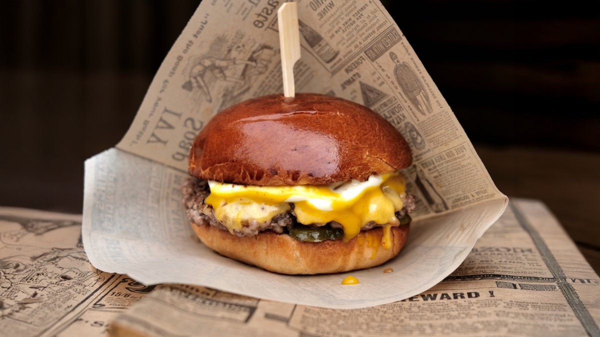 Briošs maize, baltais sīpols, marinēts gurķis, 2x smash bio-liellops, 2x čedaras siers, bekons, halapenjo, grauzdēti sīpoli, amerikāņu bbq sinepes