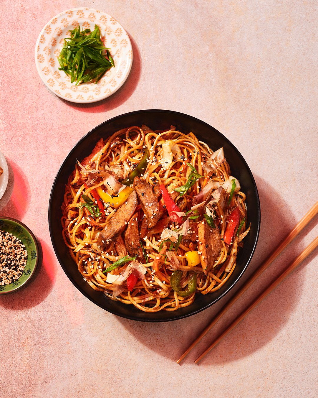 Olu nūdeles ar Jūsu izvēlēto proteīnu, papriku, olu, mūsu Yakisoba mērci, zaļajiem lociņiem, katsuobushi tunča pārslām un sezamu